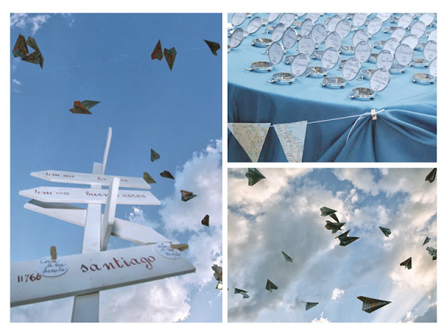 Per i centrotavola sono stati confezionati dei dischi rivestiti con mappe geografiche e stradali, e su questi, sono state disposte delle guide turistiche, dei piccoli aereoplanini in carta anch’essi ottenuti da carte geografiche, alcuni vasi di succulente e un piccolo tag come quello che accompagna i bagagli di viaggio e che aveva l’obiettivo di identificare il tavolo per l’assegnazione degli ospiti (i tavoli erano contrassegnati dalle sigle a tre caratteri che identificano gli aeroporti internazionali).